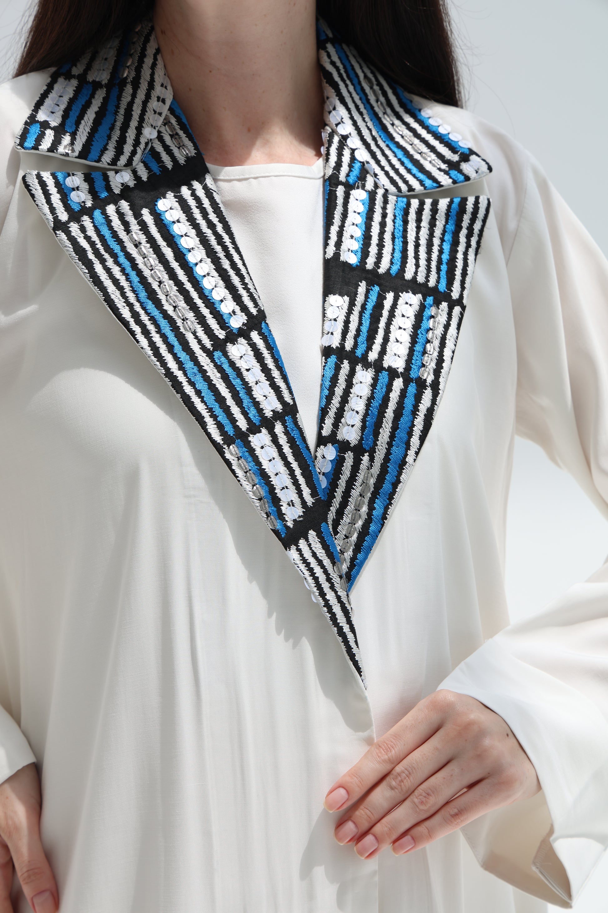 The standout feature lies in its refined collar detailing, where subtle accents in deep blue and classic black add a touch of contrast and modern flair. Whether you're dressing for a casual day out or a more formal gathering, the delicate blend of colors on the collar brings just the right amount of character to this minimalist piece.